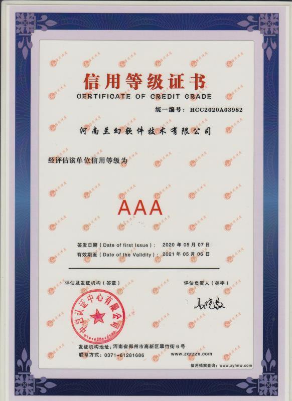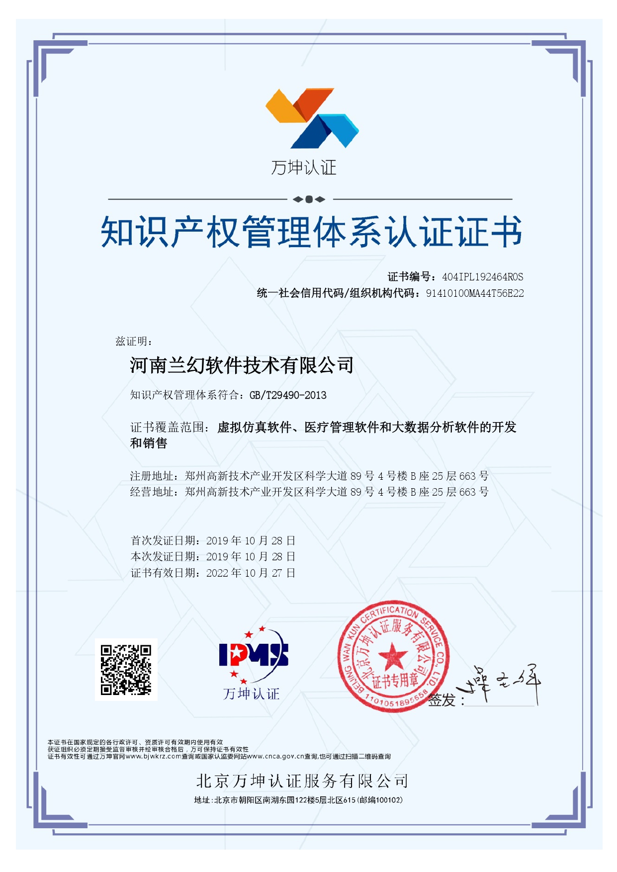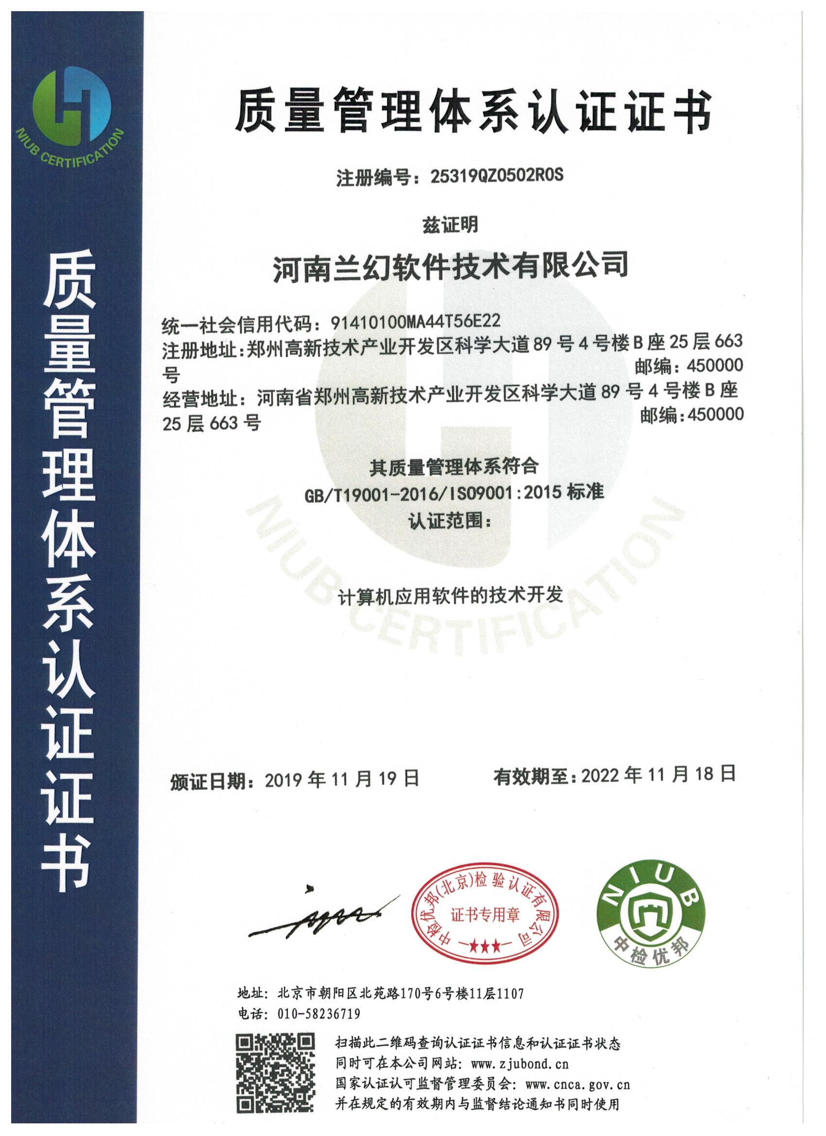 2019年獲得河南軟件協(xié)會"雙軟"認證、ISO9001質(zhì)量管理體系認證、 知識產(chǎn)權(quán)管理體系認證。