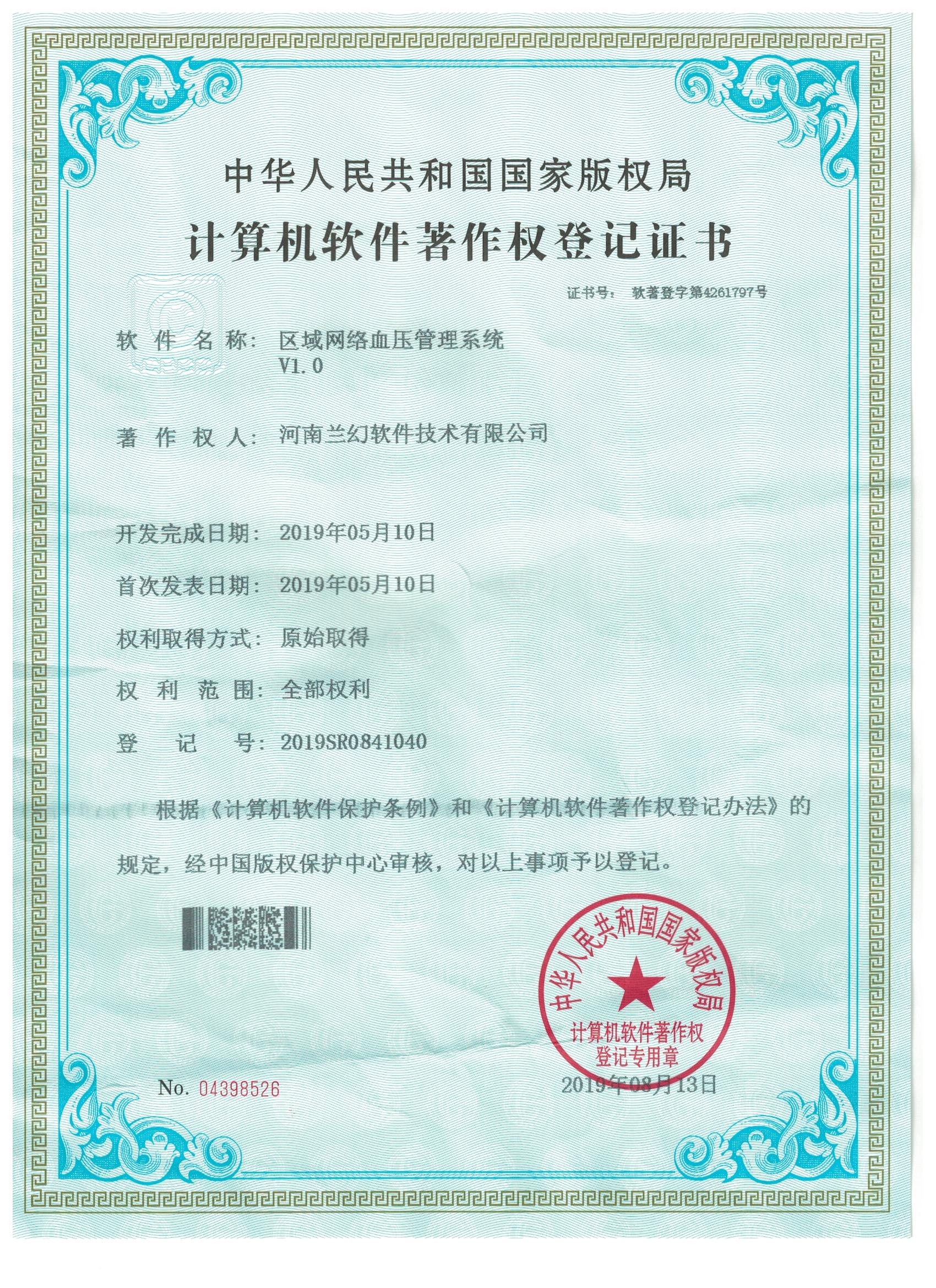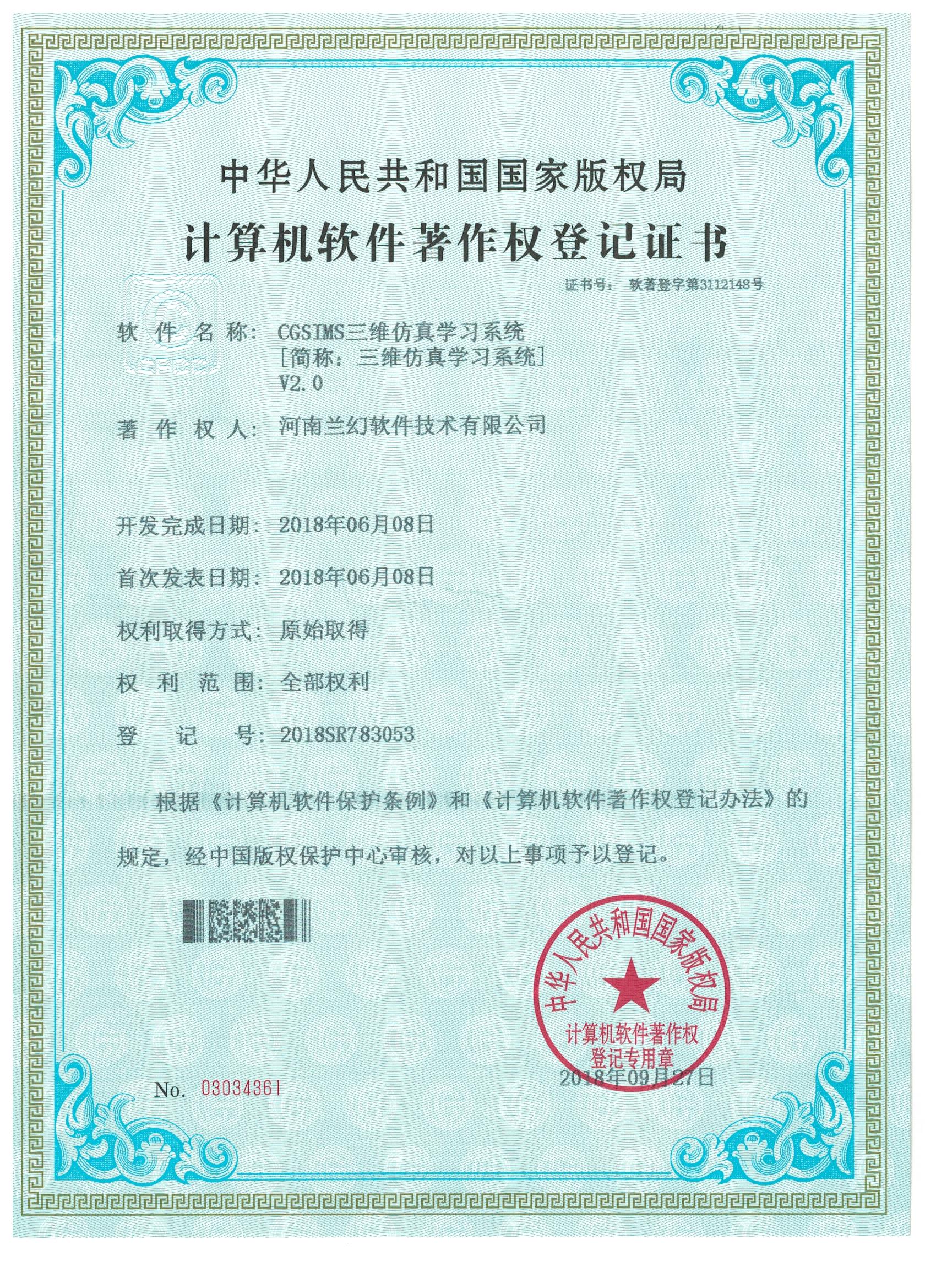 化工實訓仿真著作權(quán)證書 CGSIMS-三維仿真學習系統(tǒng)著作權(quán)證書 區(qū)域網(wǎng)絡血壓管理系統(tǒng)著作權(quán)證書
