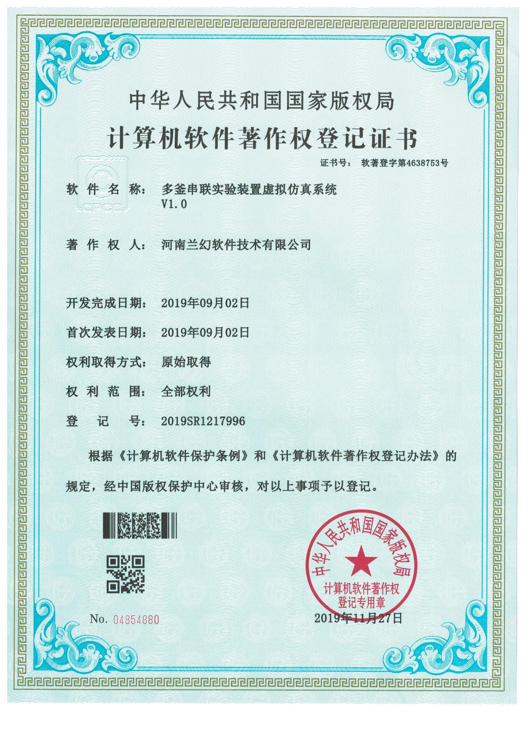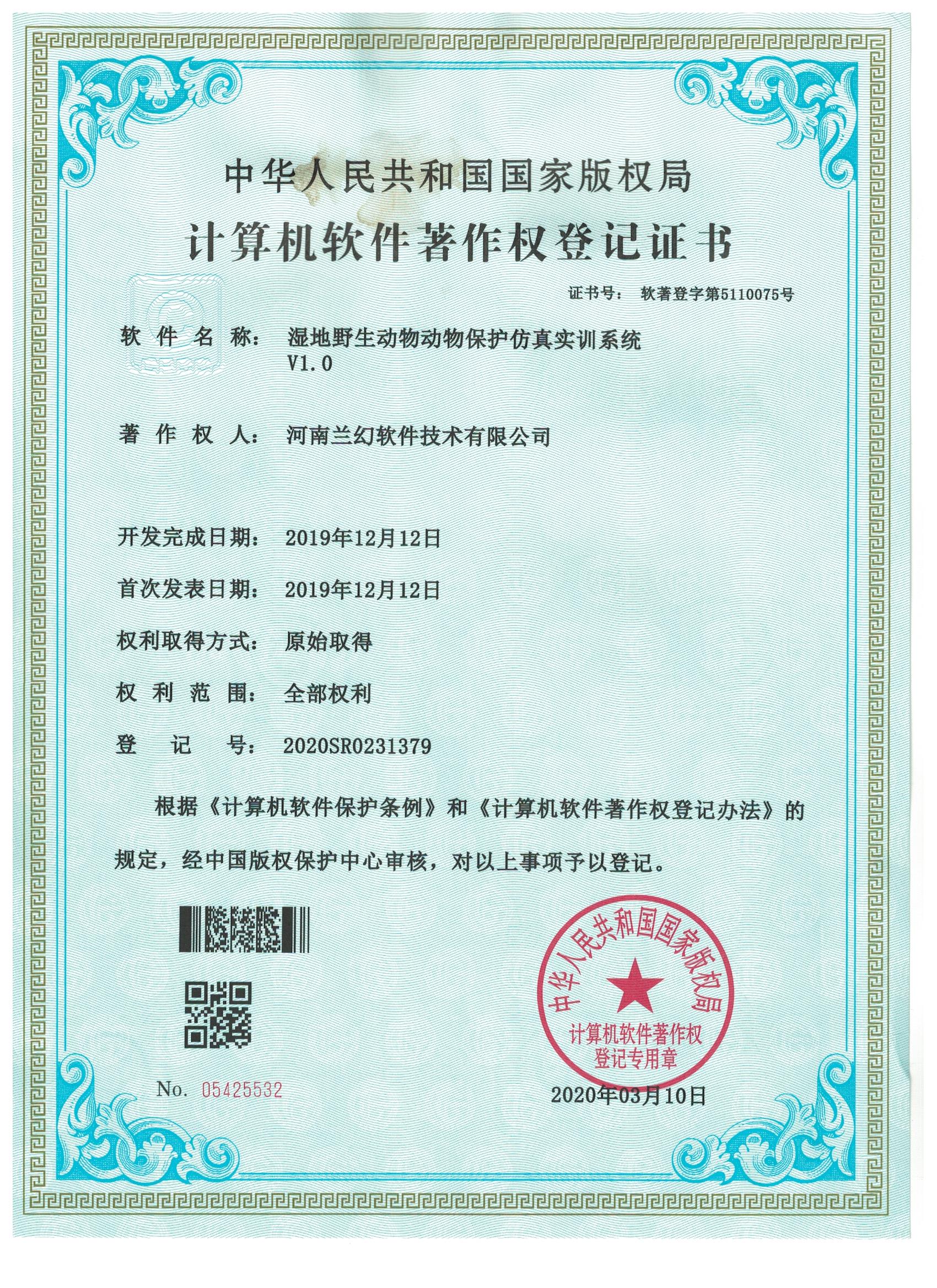 濕地野生動物保護仿真實訓系統(tǒng)著作權(quán)證書 雙套管傳熱實驗裝置虛擬仿真系統(tǒng)著作權(quán)證書 多釜串聯(lián)實驗裝置虛擬仿真系統(tǒng)著作權(quán)證書