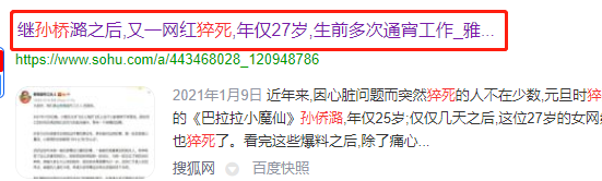 伴隨著新年腳步的到來,本該高高興興,但是卻有一些負面的新聞不斷的爆出:《巴啦啦小魔仙》美琪扮演者孫僑潞因猝死離開人世,年僅25歲,在隔不久的時間又有新聞發(fā)布出:繼孫僑潞之后,又一網(wǎng)紅猝死,年近27歲……