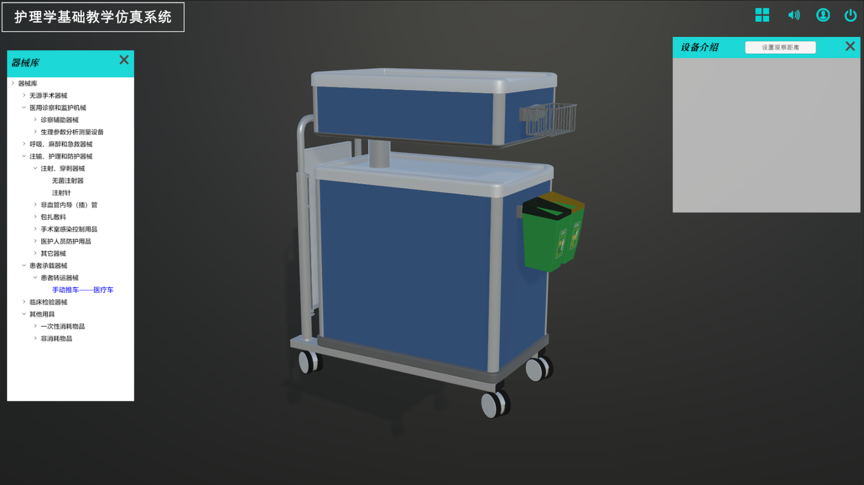 護理虛擬仿真系統-器械學習模塊:提供標準器械庫,器械庫中包含全部實訓科目中需要用到的醫療器械,所有器械分類編碼按照《國標-醫療器械分類目錄2018》標準分類。所有器械全部包含720度全視角認知、設備使用、儲存、養護說明等。