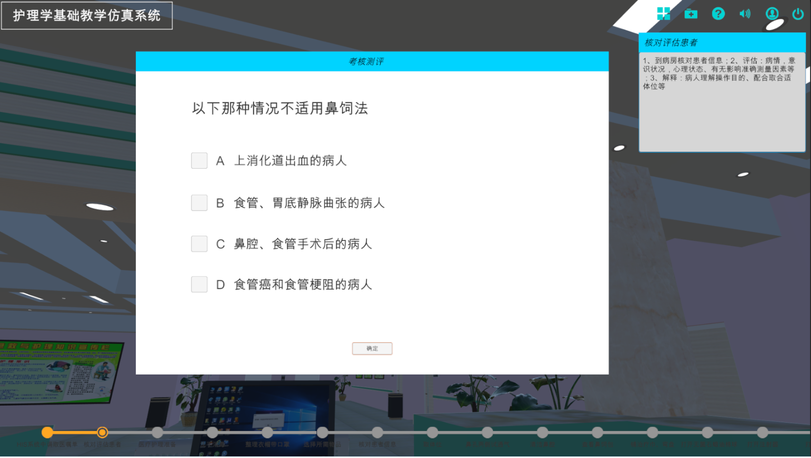 護理虛擬仿真系統-自主仿真模塊:解決實際操作業務流程認知學習的問題。把各個科目標準化操作流程進行分步驟細化,虛實高度結合,學員可以根據自己對該科目的掌握情況,選擇由任一步驟開始仿真訓練,查漏補缺強化技能。采用虛擬現實技術逼真呈現實驗實訓的場景、設備、用品工具等。在自主仿真訓練模式下虛擬仿真操作流程帶引導提示。護理虛擬仿真系統-自主仿真模塊可隨意選擇每個步驟進行操作訓練,增加學員學習的自主性,便于每個學員根據自己掌握情況進行選擇性學習。